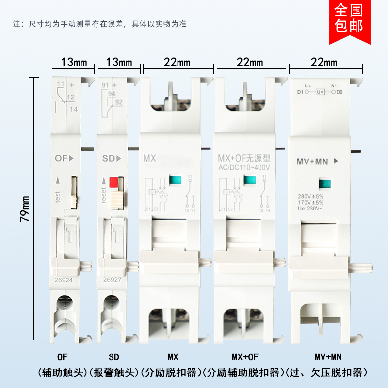 SD alarm contact OF Auxiliary contact MN (Undervoltage tripper MNS Voltage loss tripper MV Overvoltage tripper MX Shunt tripper AC DC24-48V