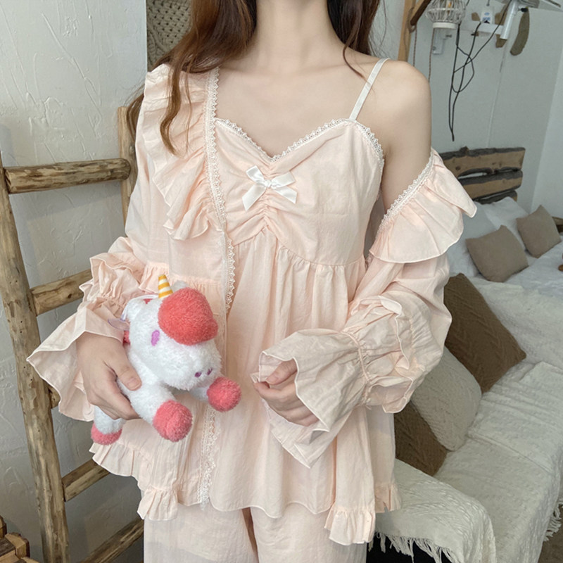 Fairy coat Sweet bow suspender pajamas Women's spring and autumn ruffle pajamas Home clothes three sets can be worn outside