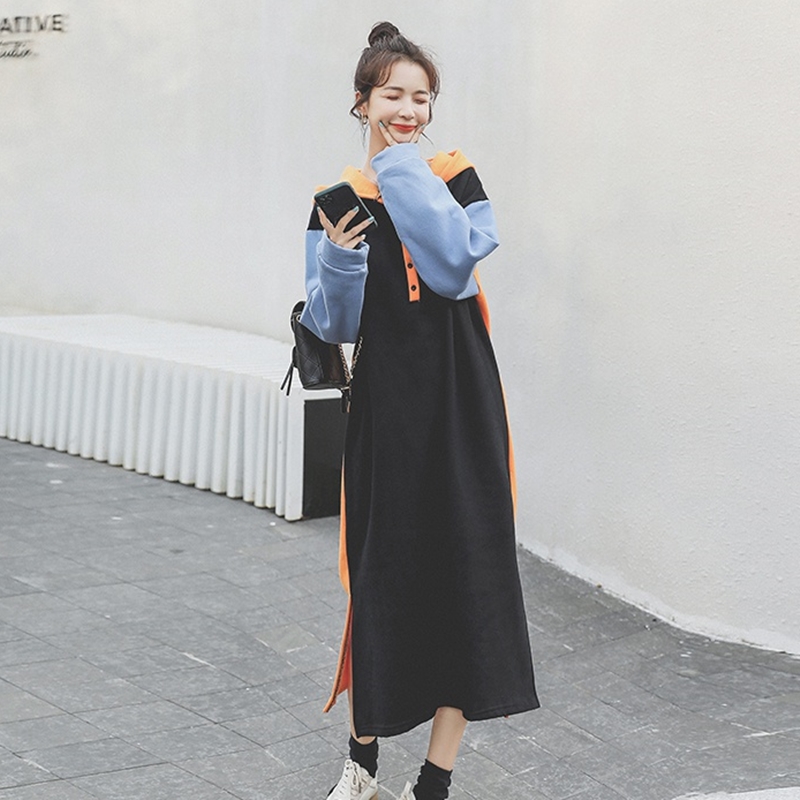 Pregnant women's dress medium and long version of autumn and winter hooded late pregnancy plus velvet loose fashion foreign school age age pregnant women's clothing