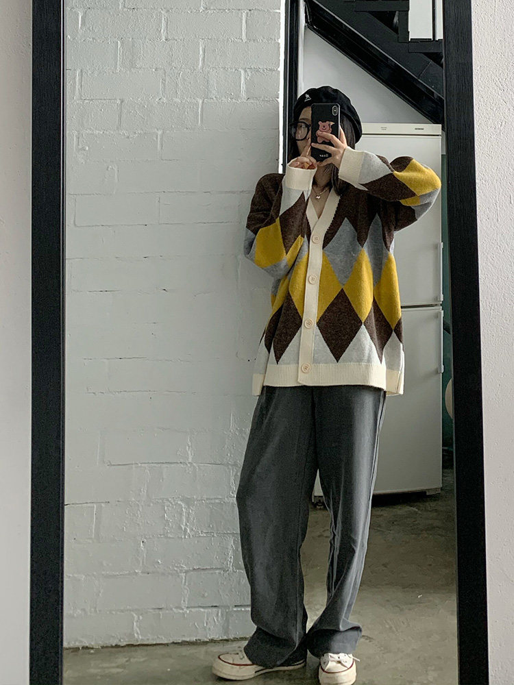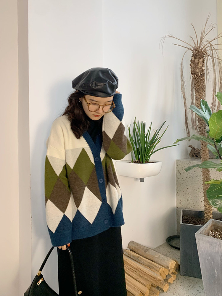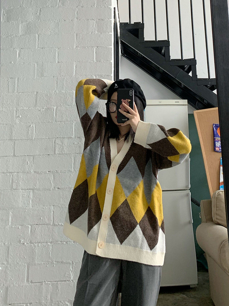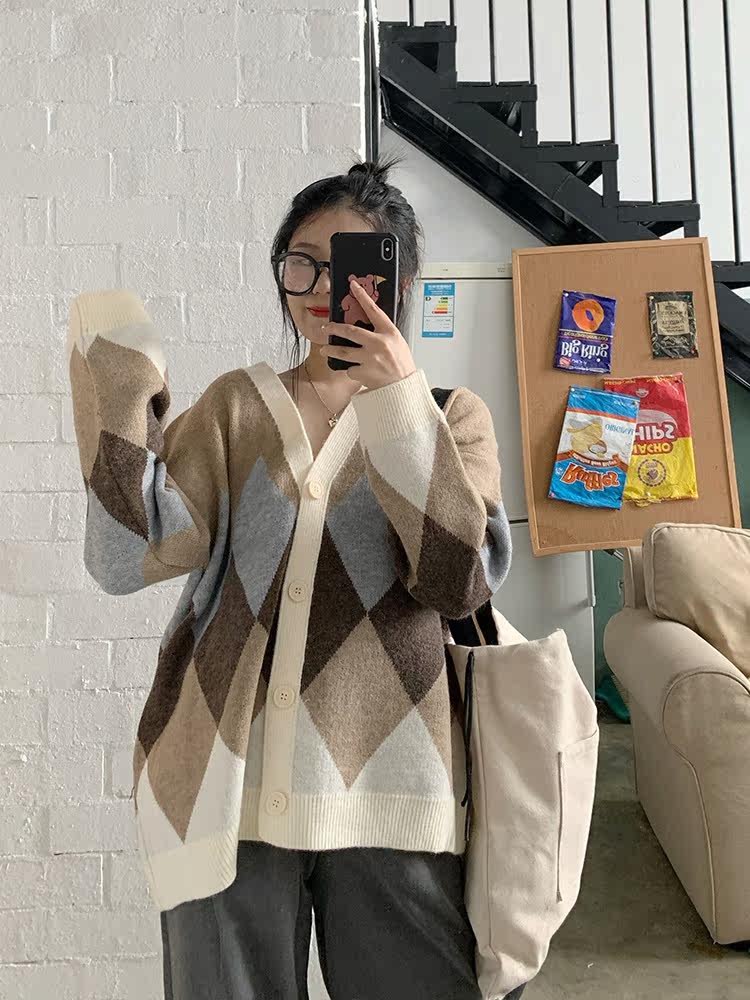 Generally cute rhombus sweater cardigan women 2020 new spring and autumn loose lazy wind long-sleeved outerwear jacket