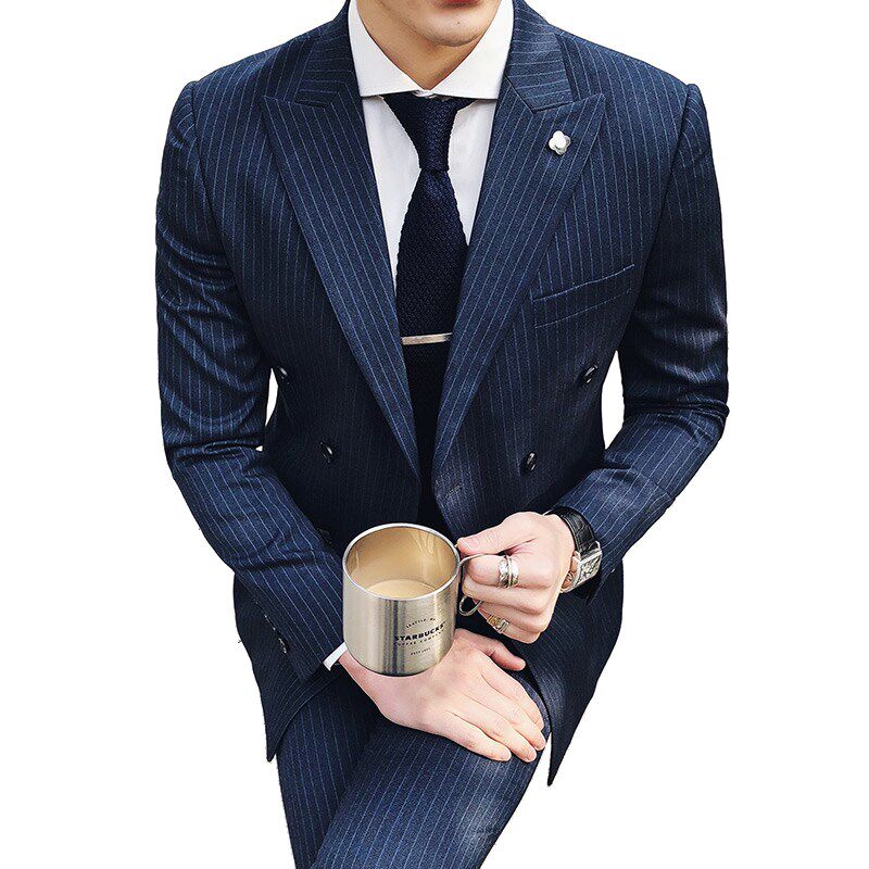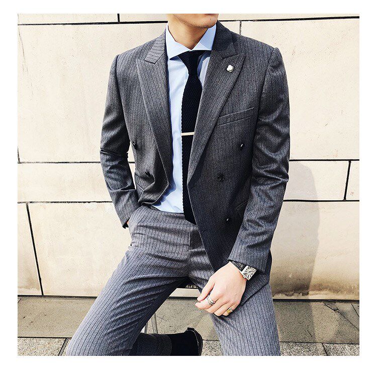 Korean version striped suit suit men's body double-row button Inn Wind youth trend casual handsome wedding suit