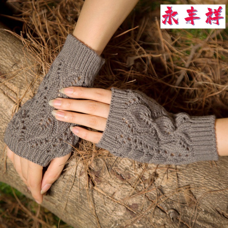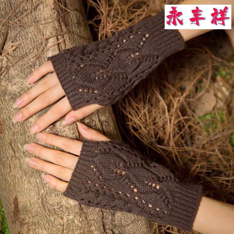 Autumn-winter office Outer lapped wool-knit Chaulotide finger-half finger typing warm female two-piece leaves hollowed-out glove