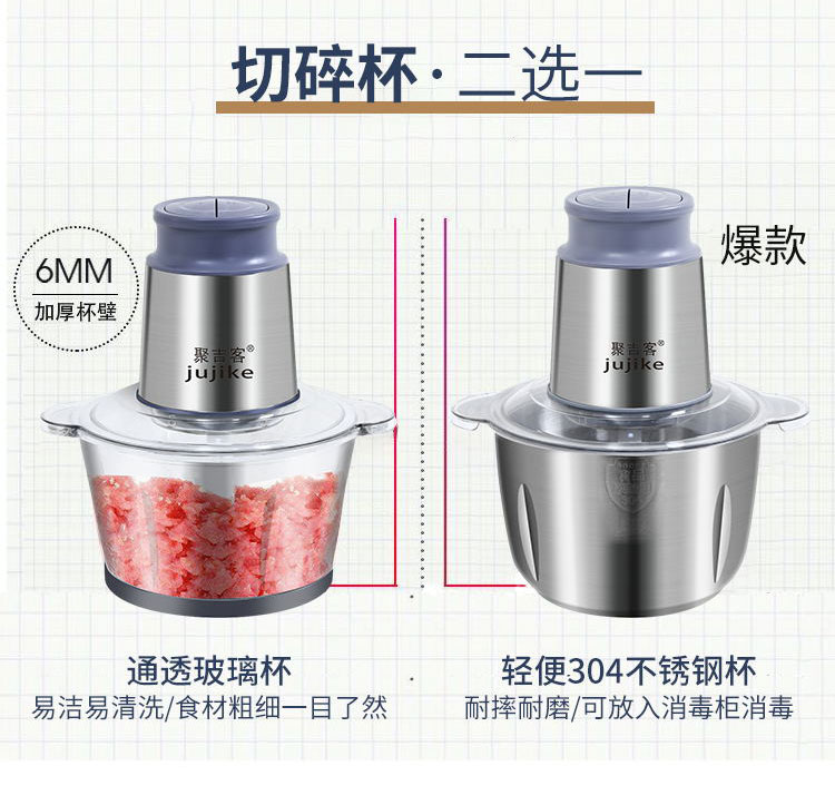 2 liters large capacity (glass bowl) * 1 set of knives 2 liters large capacity (glass bowl) * 2 sets of knives 2 liters large capacity (304 stainless steel bowl) * 1 set of knives 2 liters large capacity (304 stainless steel