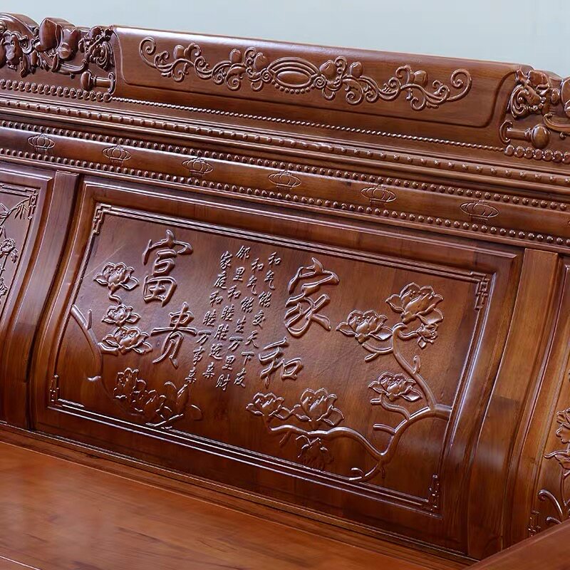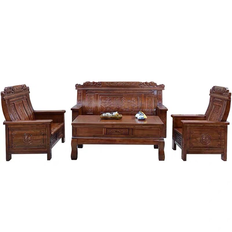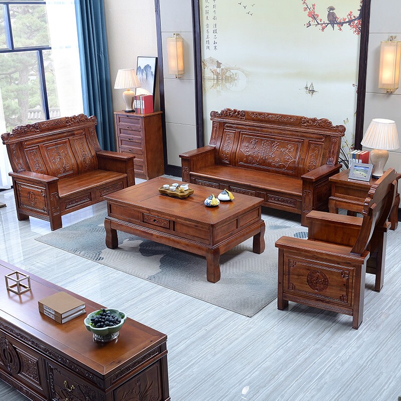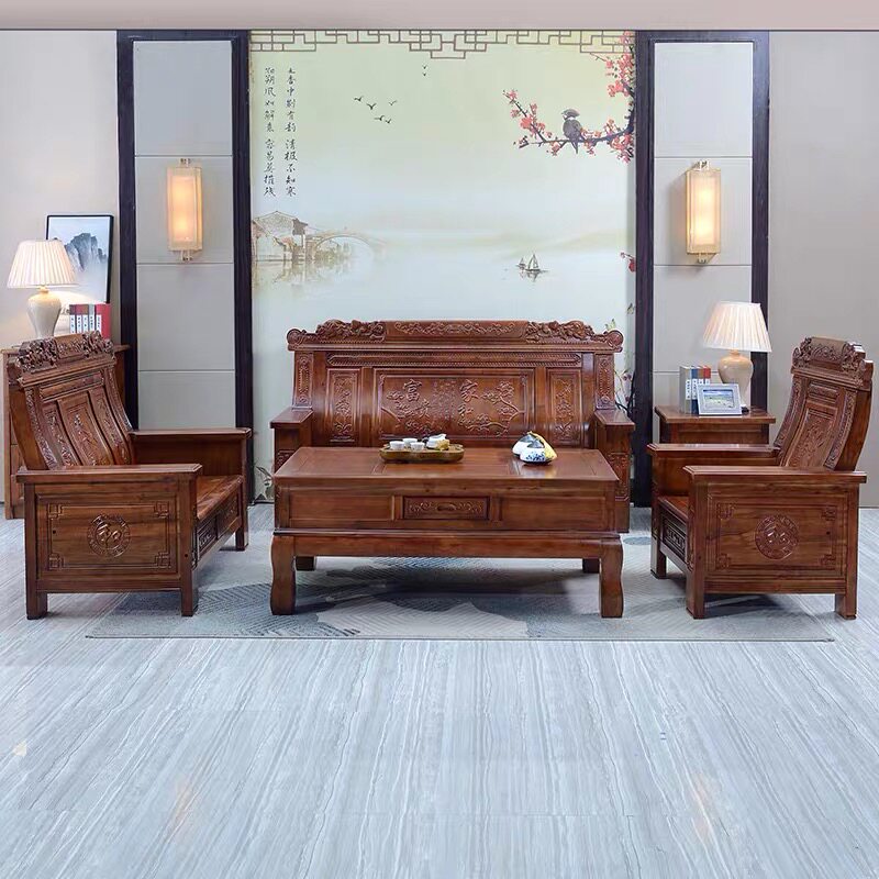 All solid wood camphor wood sofa coffee table combination Chinese carved living room office wooden three-person chair rural economy