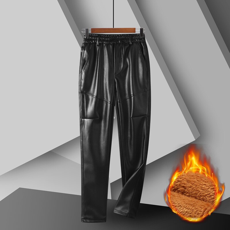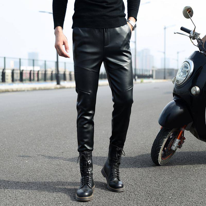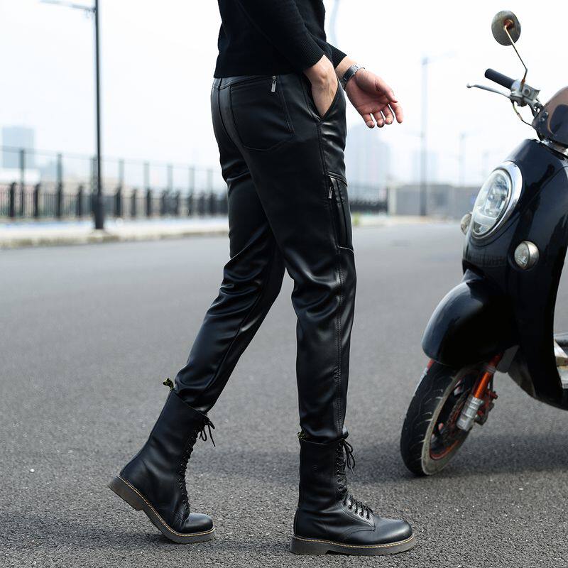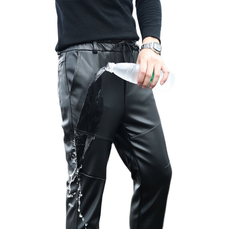 Slim-fit leather pants men's motorcycle waterproof pants tight stretch feet plus velvet padded leather pants elastic waist