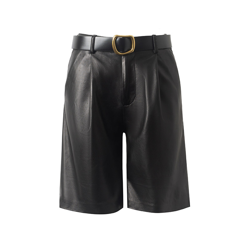 KC Home 2022 Spring New Bermuda Shorts Black Sheep Leather High Waist Straight Drum Pants 50% Leather Pants