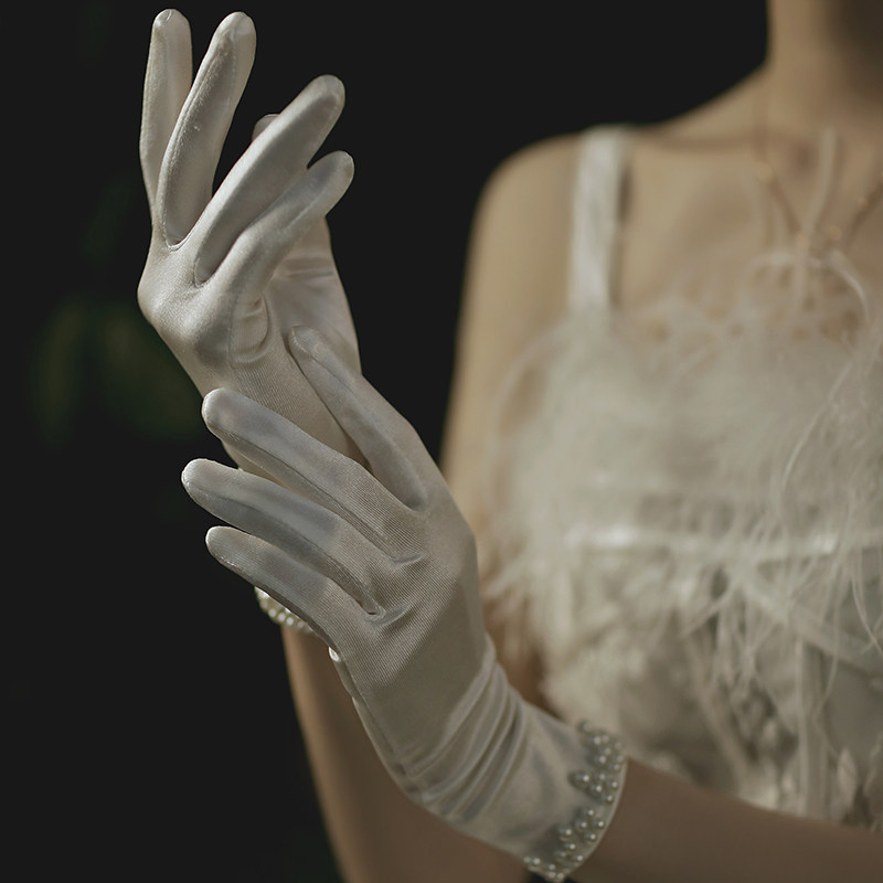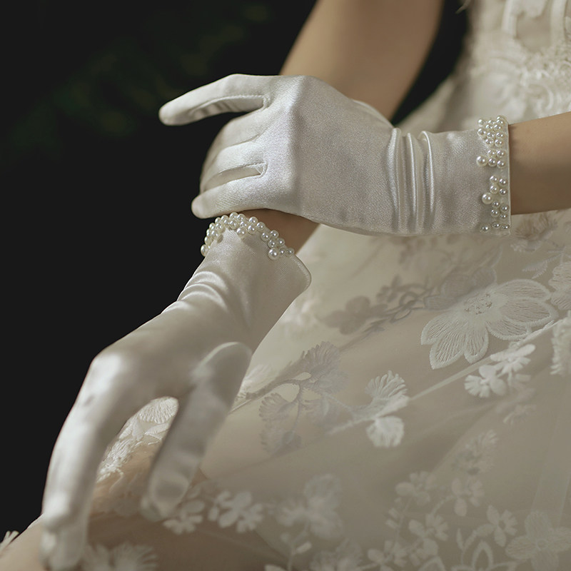 Bridal gloves 2020 autumn and winter new satin stretch pearl wedding photography wedding gloves wedding Korean elegance