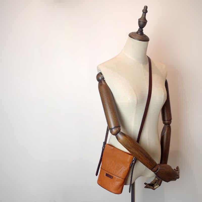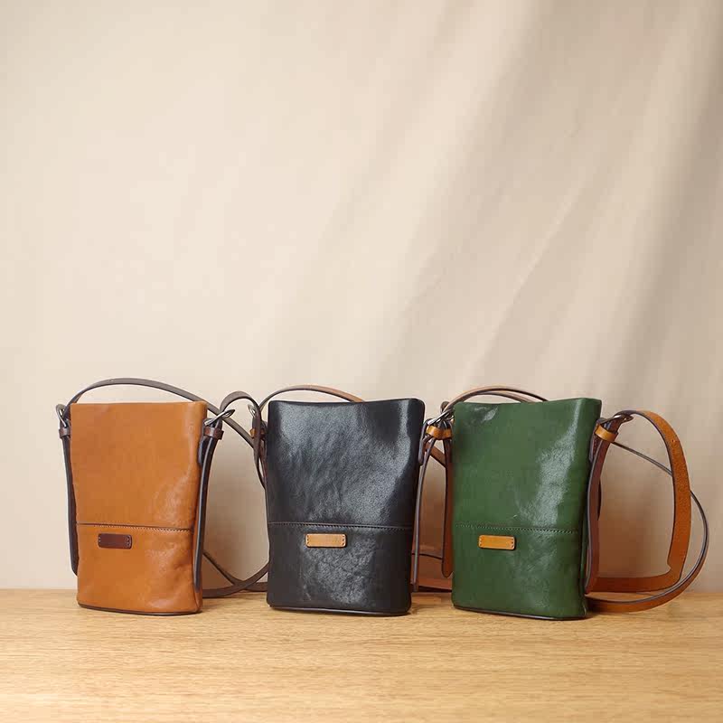 Retro leather women's bag mini bag messenger bag bucket small bag simple literary vegetable tanned first layer cowhide mobile phone bag