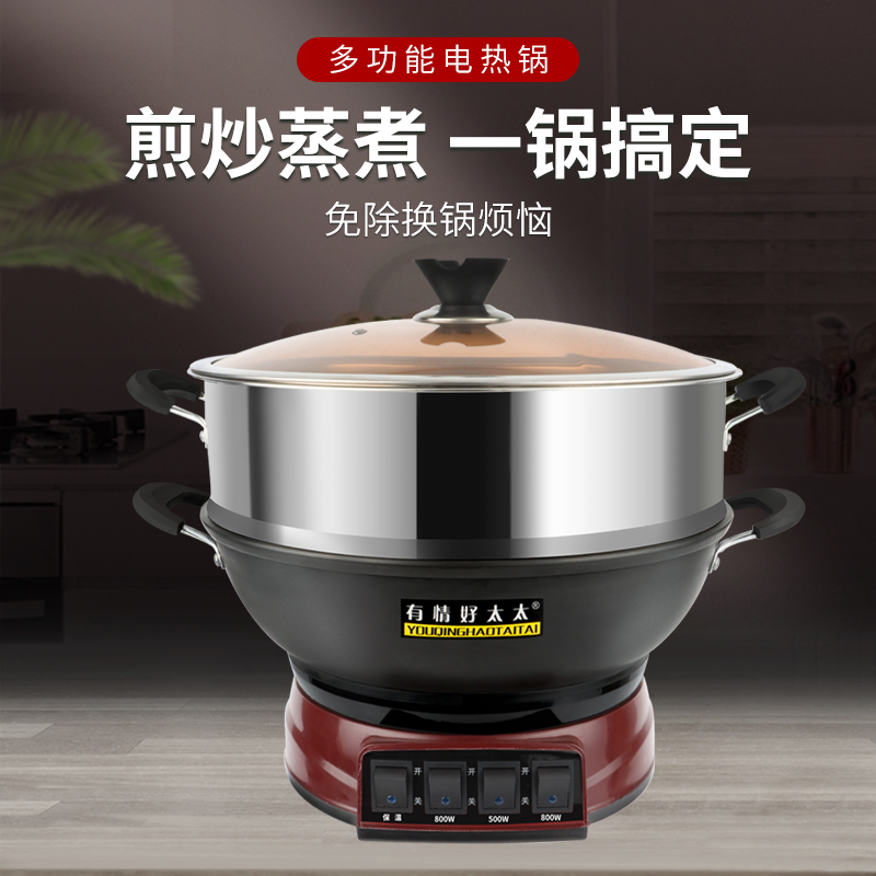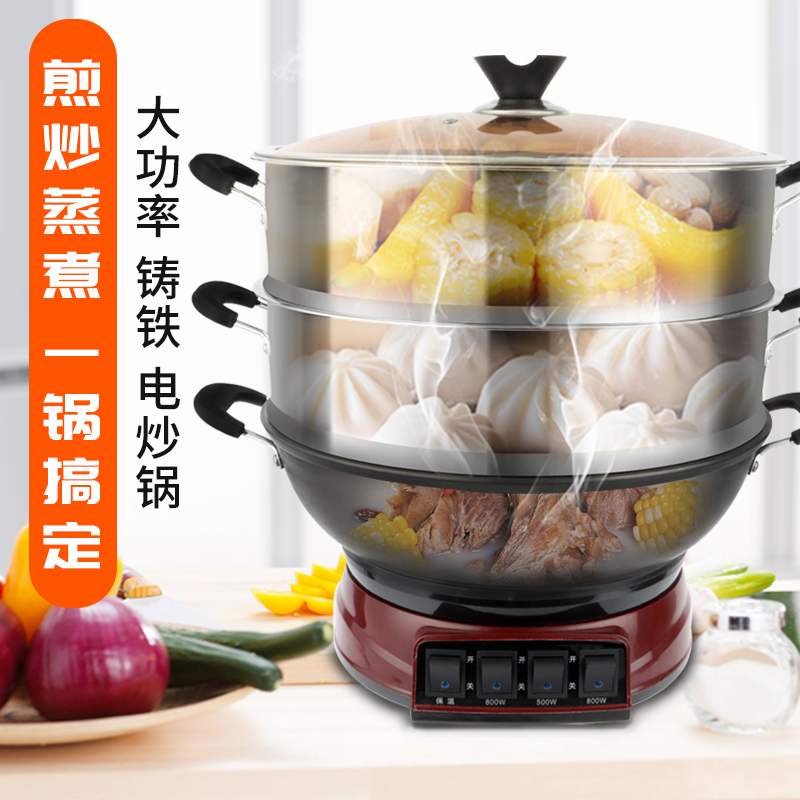 Electric frying pan multi-functional household electric stir-frying dish steaming one pot electric pot with steamer cage large capacity non-stick pot electric pot