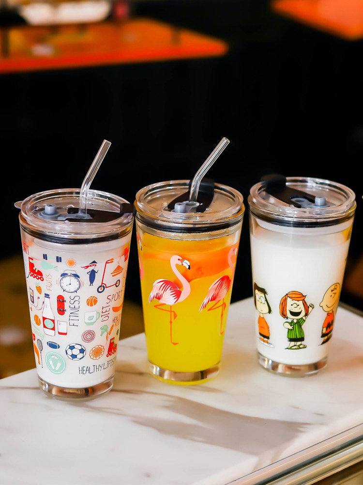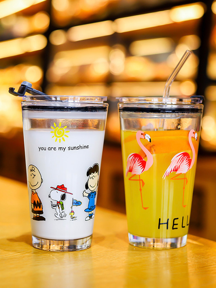 Cute creative transparent graffiti glass high-value Internet celebrity milk juice cup sealed children's straw water cup
