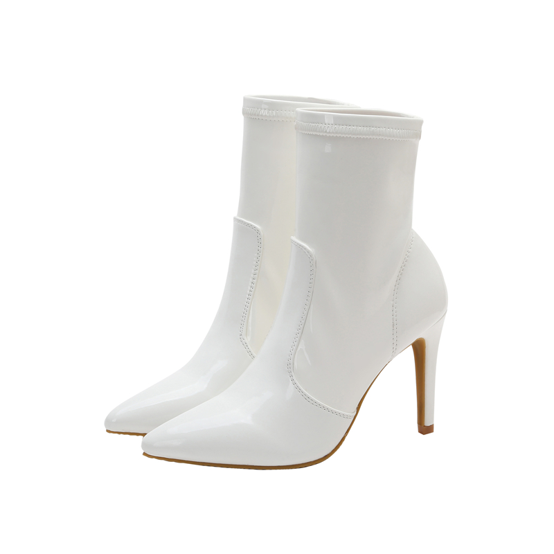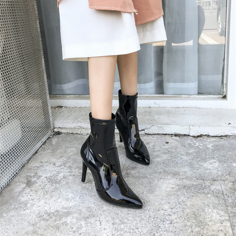 2021 new thin-heeled elastic boots women's mid-tube spring and autumn single boots pointed toe thin boots high-heeled ankle boots patent leather Martin boots