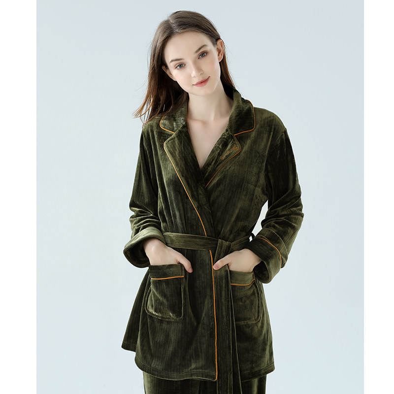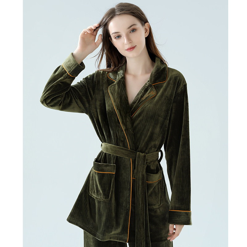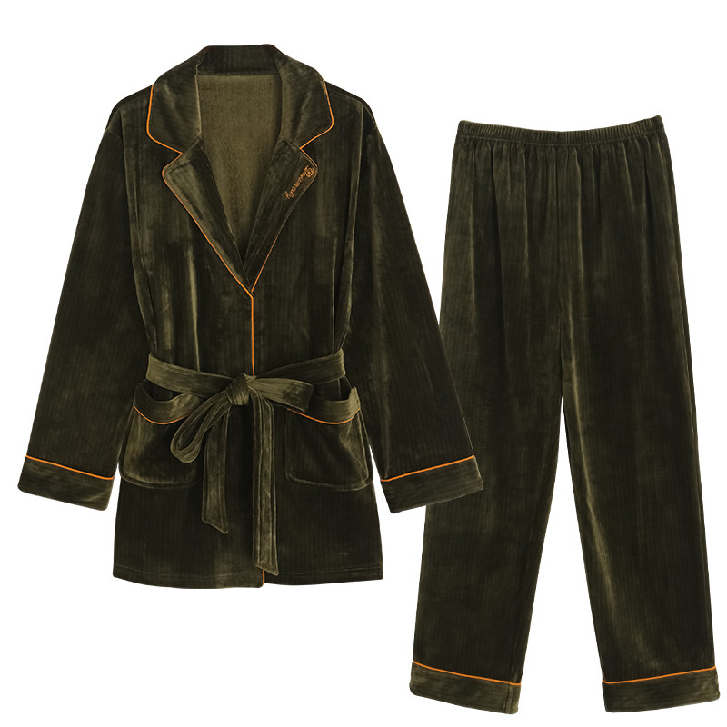 IIZZINI Pyjamas Woman Autumn Winter Long Sleeve Coral Suede Lace Flannel Simple Brown Green Long Pants Home Suit Suit
