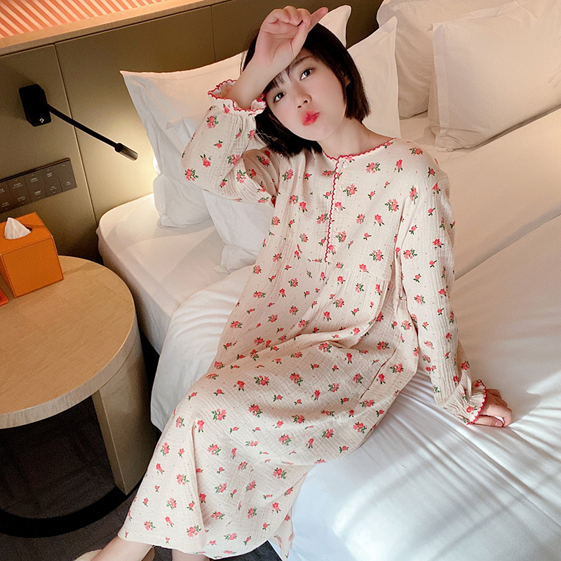 Broken Flowers Sleeping Dress Lady Spring Autumn Long Sleeves Princess Han Edition Sweet Beauty Pyjamas Gauze Thin and long version large size for pregnant women's stay-at-home clothes