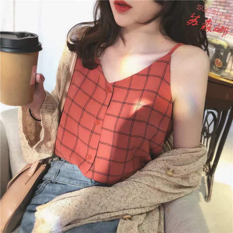 Port Taste Retro Chic Plaid Small Harnesses Female Heart-shaped Machine Inner Lap Snow Spinning Vest Loot Outside Wearing Undershirt Blouse Summer