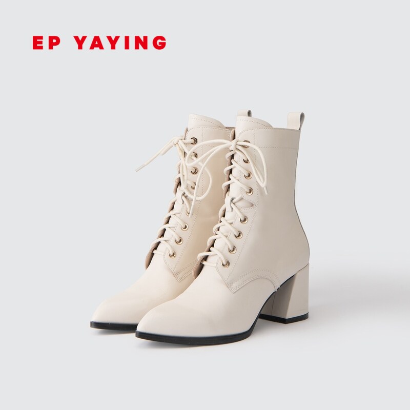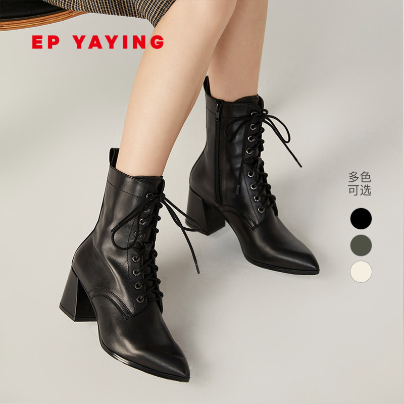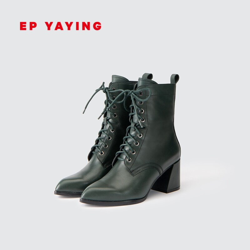 EP YAYING Yaying women's shoes retro wind pointed square high with cow's leather Martin boot mall in the same section X513A