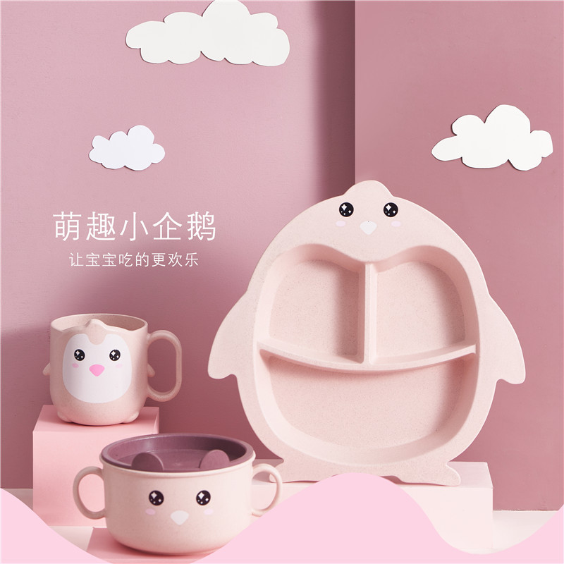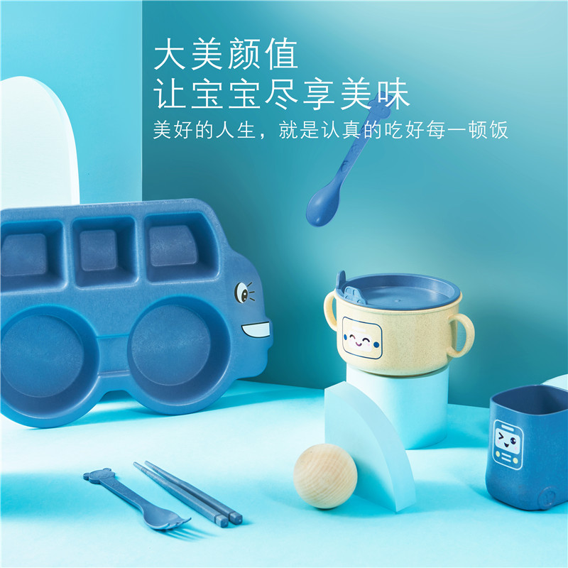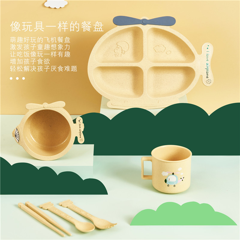 Children bowls 6 pieces of cutlery 2021 wheat straw eco-friendly Dinner Plate Cute double ear bowls Milk Cup Gargling Cup