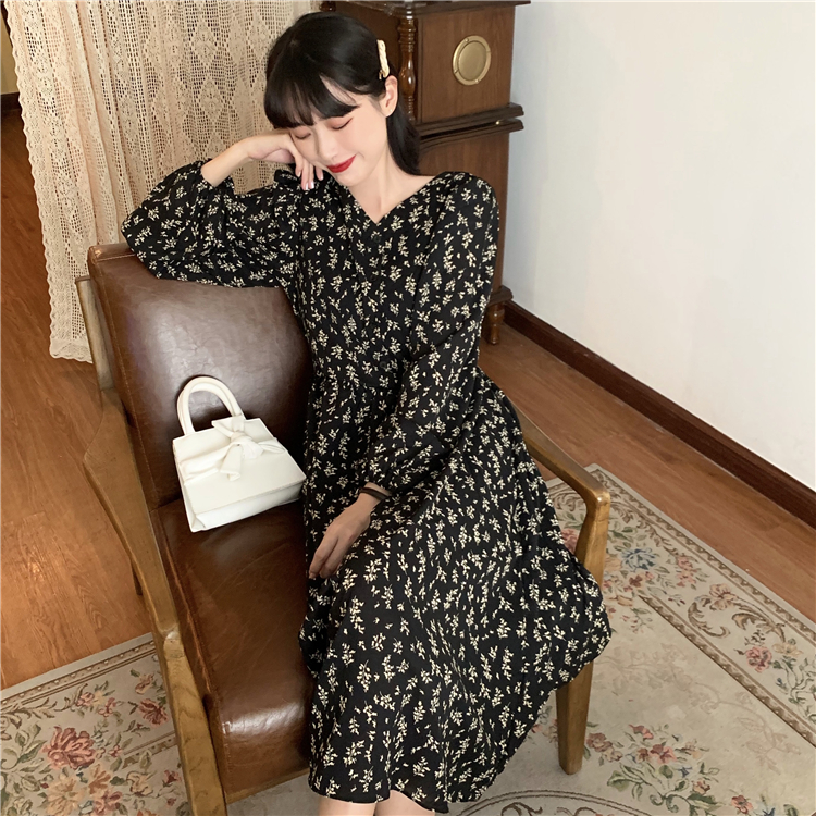 2021 New base skirt with autumn floral French small man long sleeve retro dress women's winter