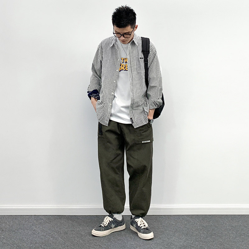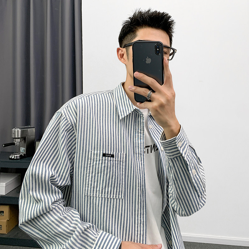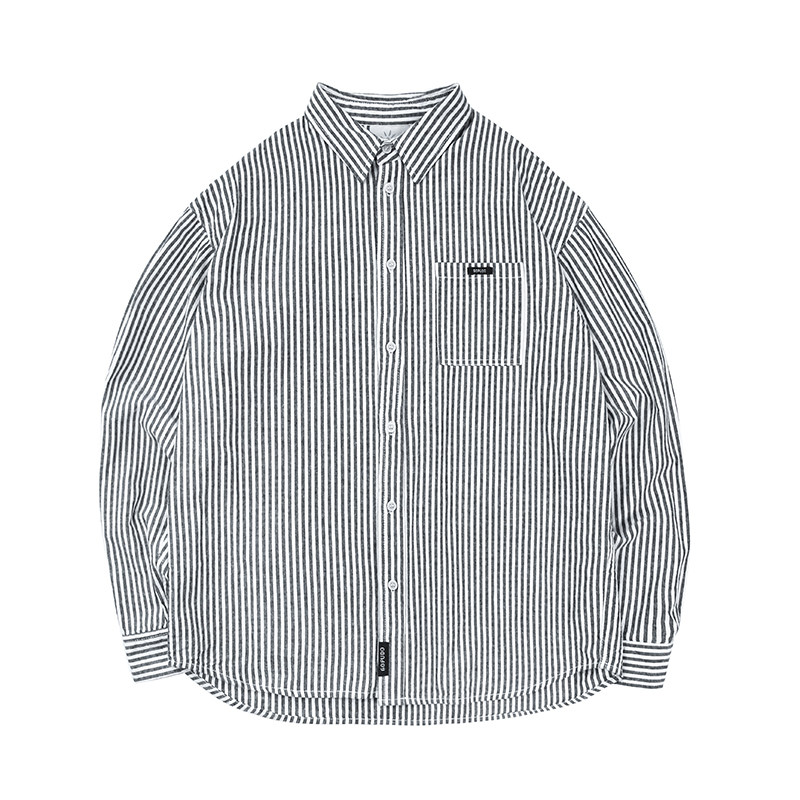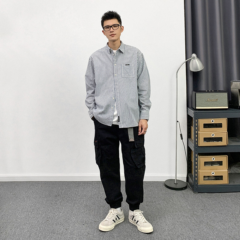 REEZ (the owner wears) Japanese loose tooling vertical striped long-sleeved shirt men's spring casual trend shirt