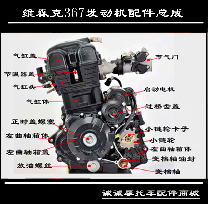 Left crankcase cover Right crankcase cover Left crankcase body Right crankshaft box body Cylinder head camshaft rocker arm with bracket 2 valves 1 set 4 timing chain sleeve cylinder main and secondary shafts Forks Subspin roller needles Full car gasket magnetic cylinder EFI version Magnetic steel belt beyond clutch + large tooth coil water pump cover Water seal assembly Oil filter cover Oil filter core spark plug 2 Throttle assembly crankshaft connecting rod