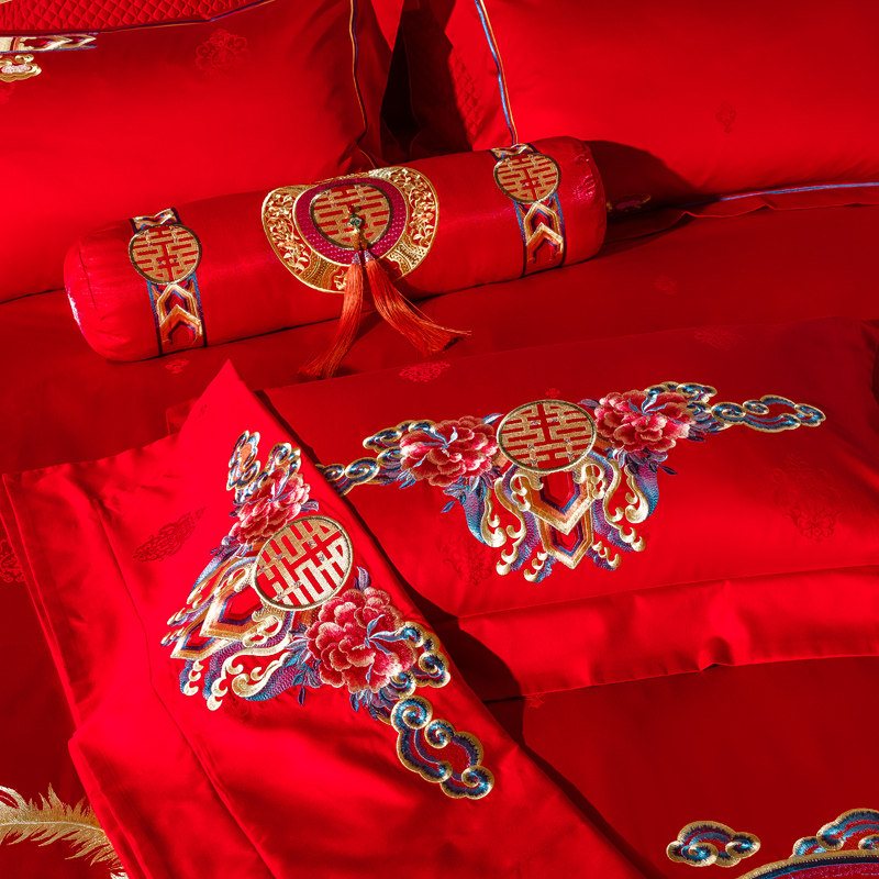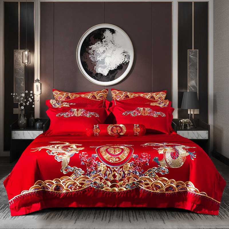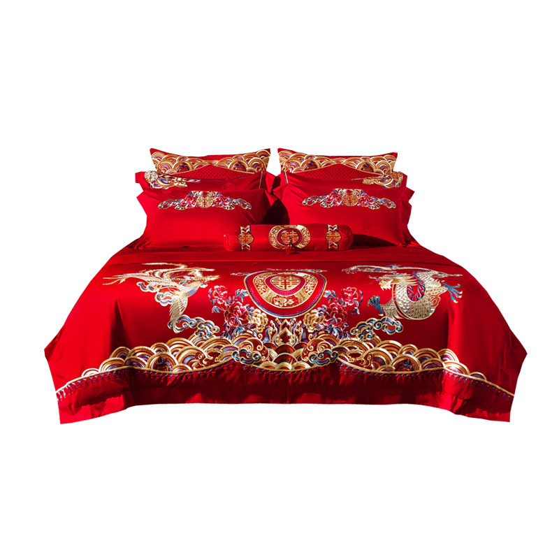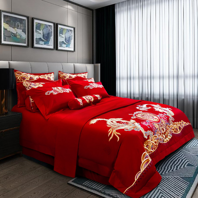 High-end 100-count cotton bridal bedding multi-piece set luxury Chinese embroidery wedding room 1 8 sets