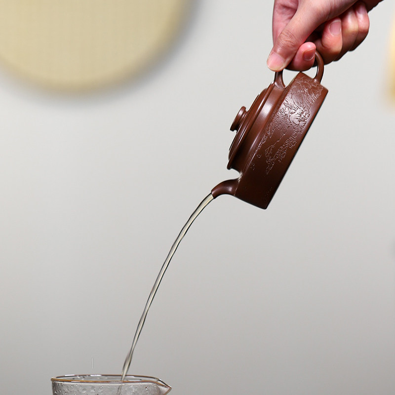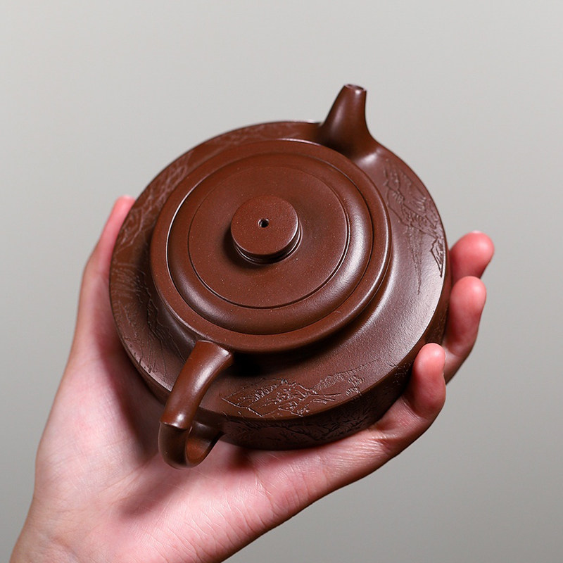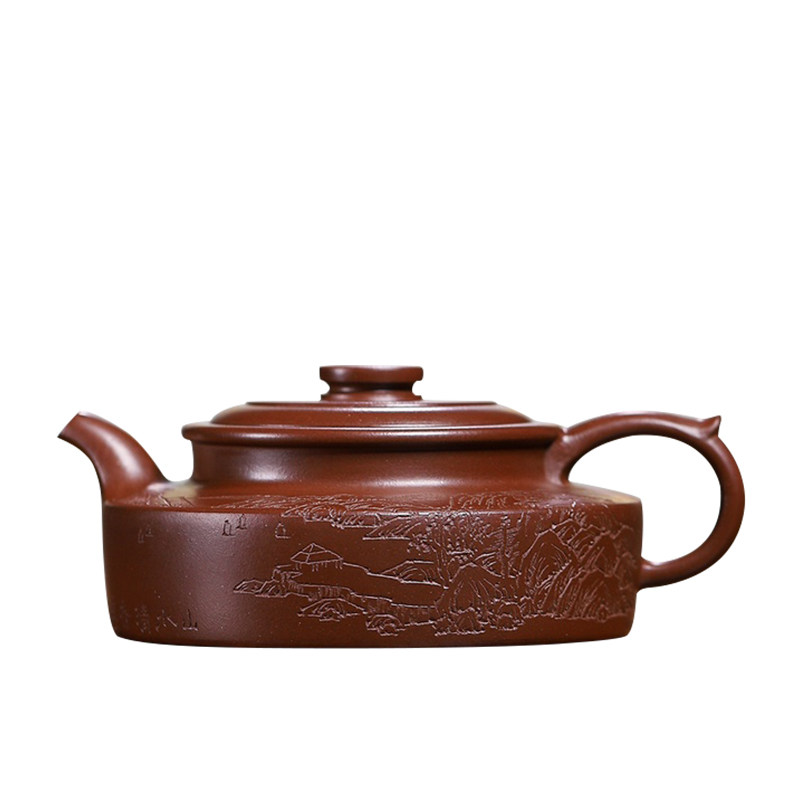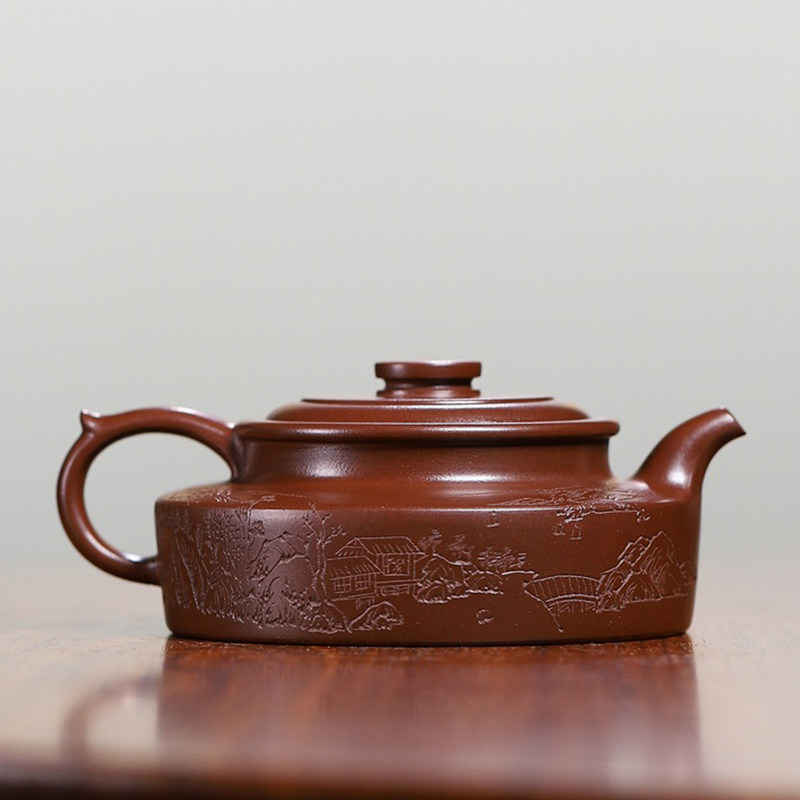 High-work-carved scenery Zhoushan Guan Guoyang, teacher Hua Ting raw mine purple clay 170cc Yixing Purple Sand Pot Pure Artisanal-Taobao