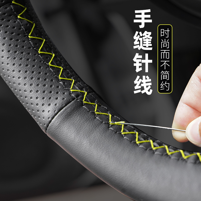 Hand-sewn steering wheel cover (black leather and black line) low-key and versatile Hand-sewn steering wheel cover (black leather and green line) recommends green and gray interior options Hand-sewn steering wheel cover (black leather and white line) recommends white and gray interior options Hand