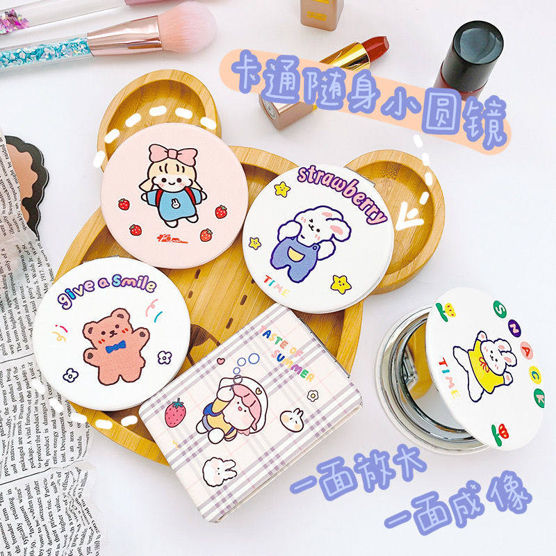 ins Girl heart cartoon folding double-sided mirror portable makeup mirror Net red soft cute bear PU mirror for women to carry