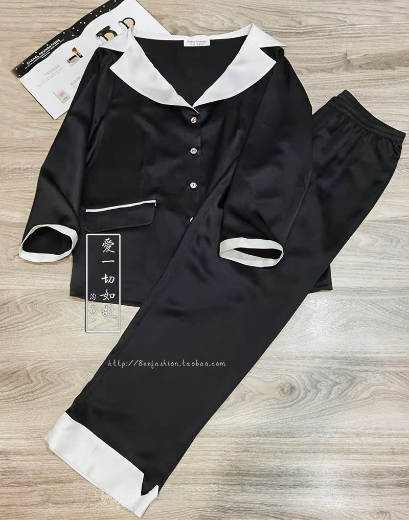 Black and white custom women's 100% mulberry silk pajamas large lapels long sleeves contrast housewear 22mm
