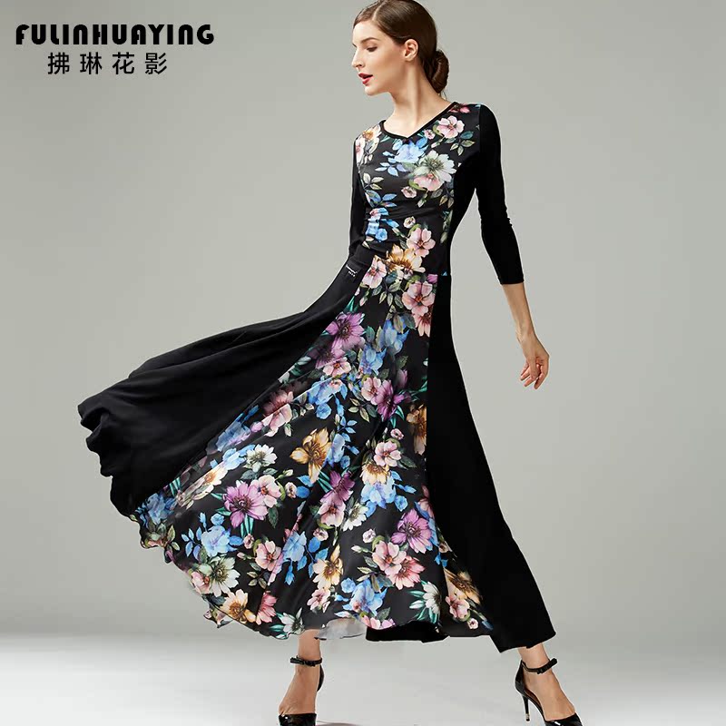 Pretlin floral printed morden dance dress for autumn and winter new national standard dance dress social dance long sleeve practice dress