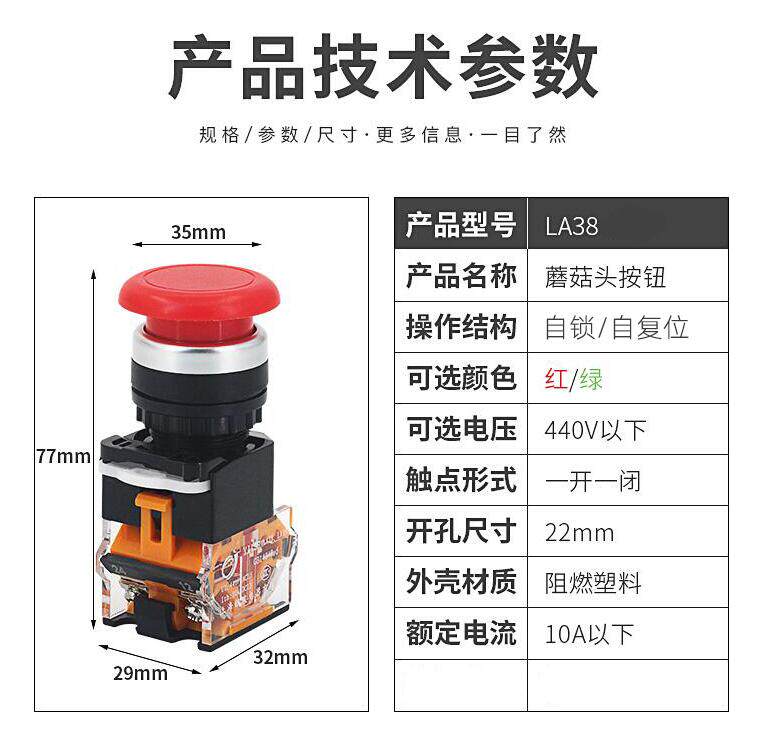 LA38 button switch Click from reset press mushroom head self lock power start switch open 22MM
