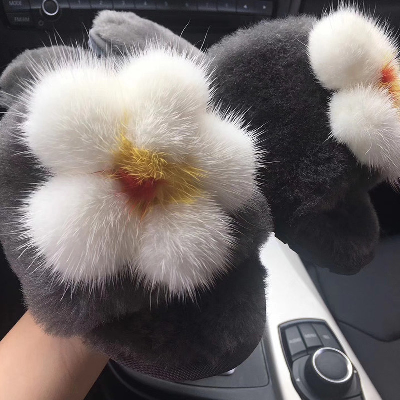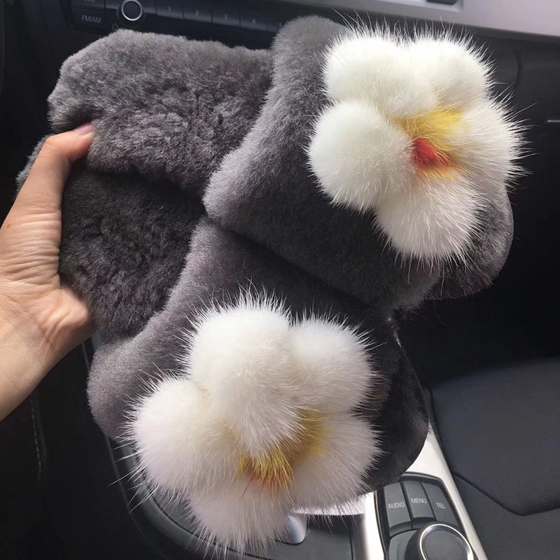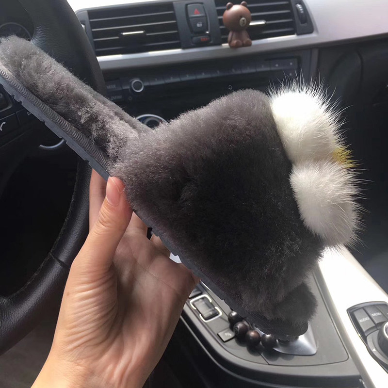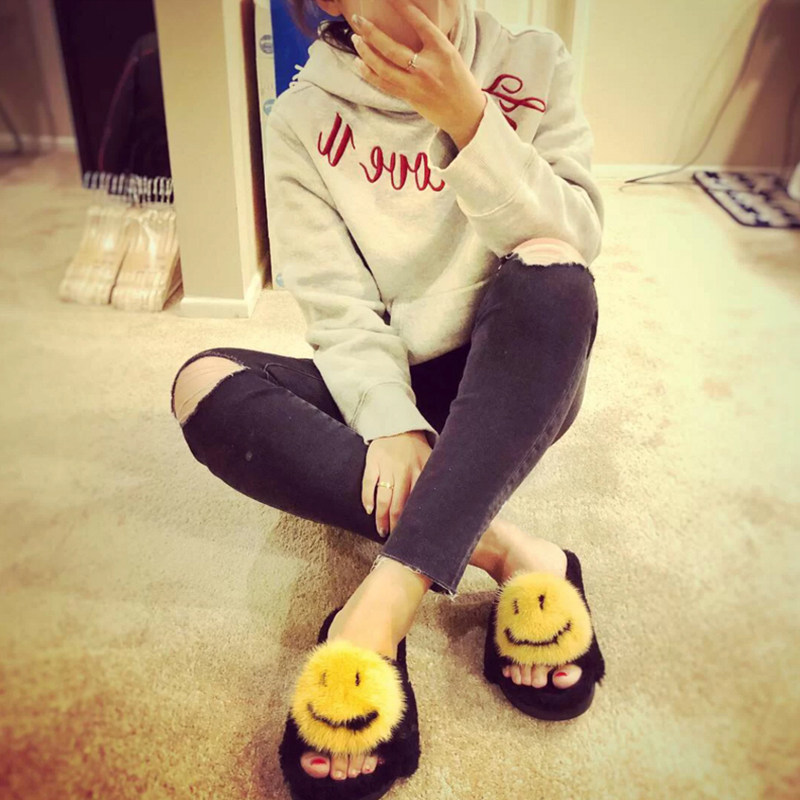 Fur slippers female outside wearing 2021 new black smiley face ferret wool slippers flat bottom warm comfort women's shoes