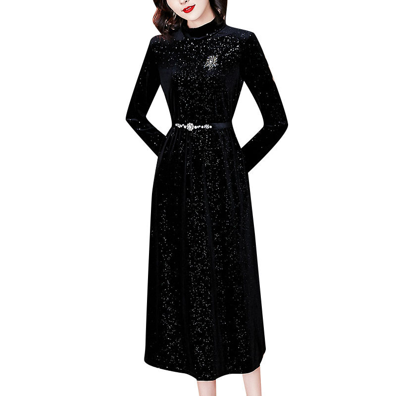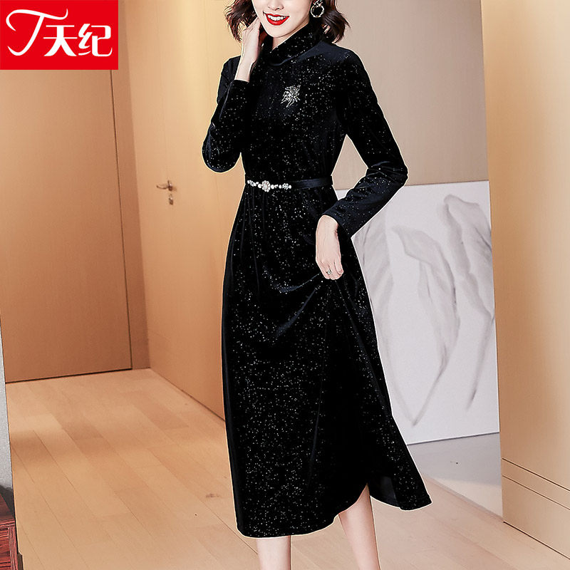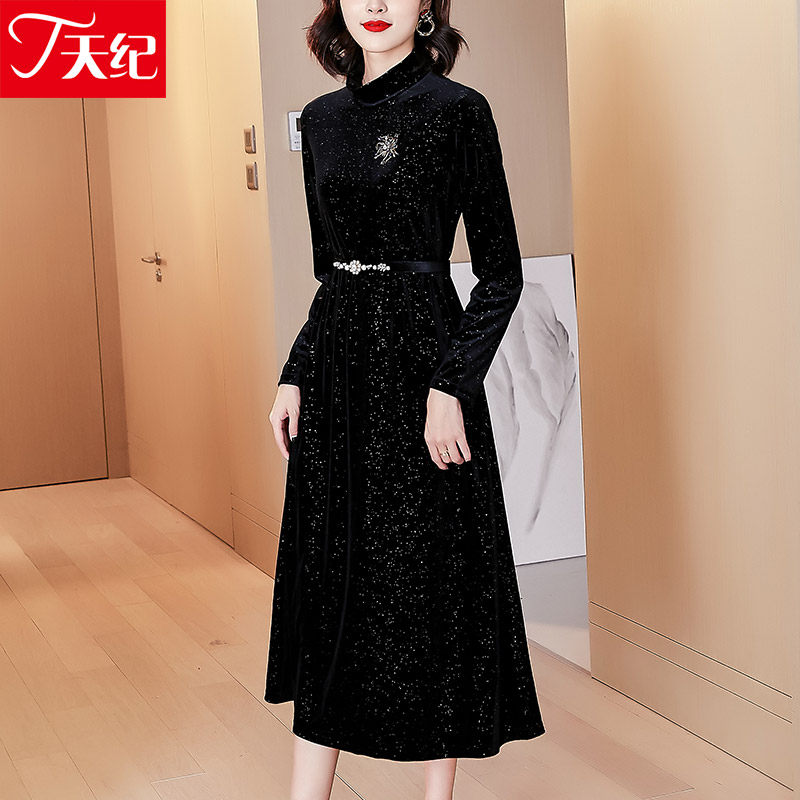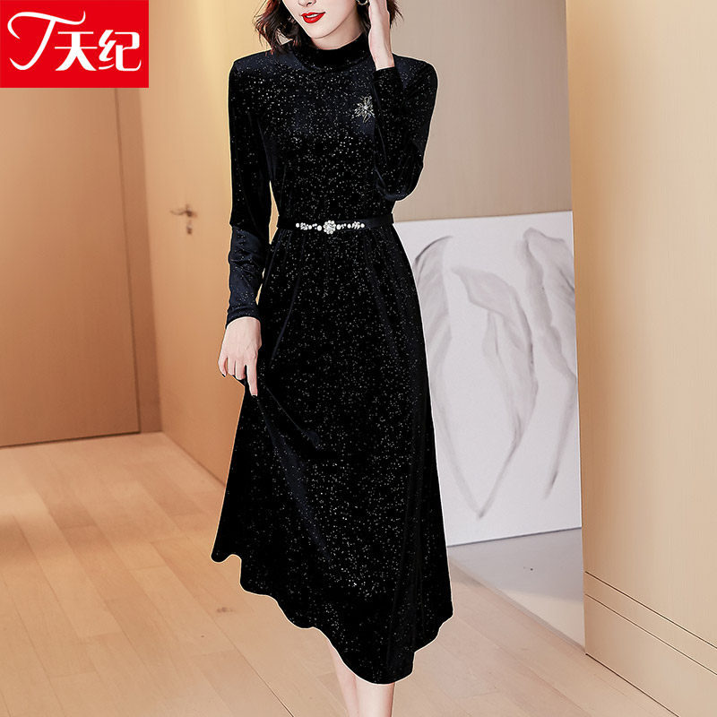 Golden Velvet Foreign Dress Noble Lady Foreign Pie 2022 Autumn Dress New Women's High-end Accessories Hitch Bottom Skirt