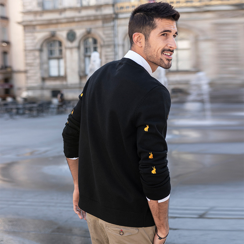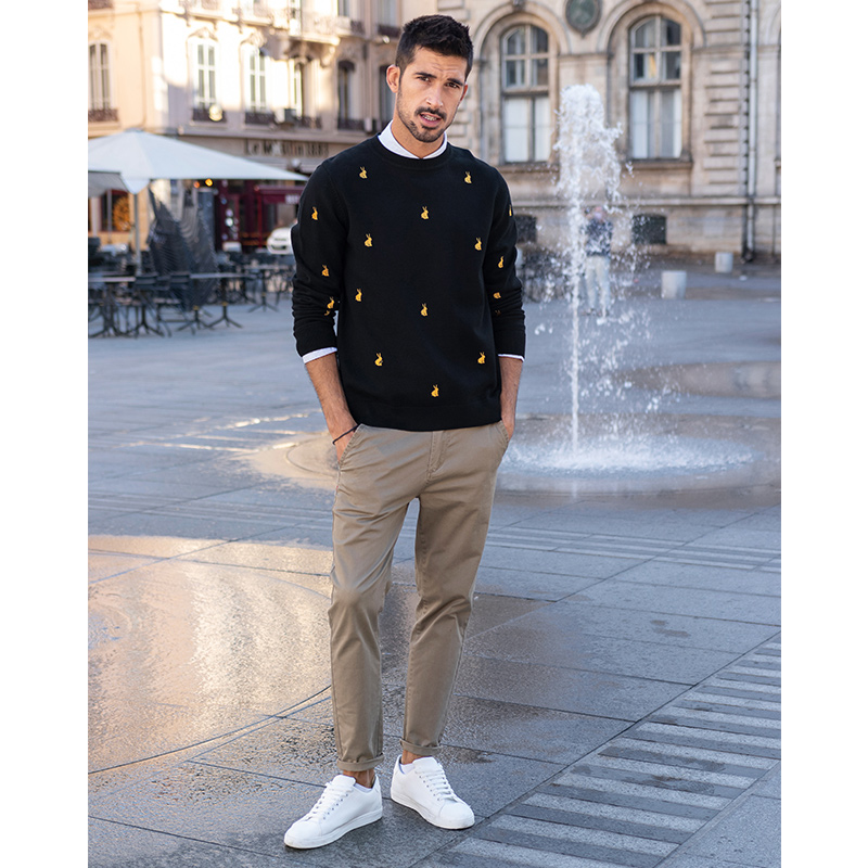 Special offer] Men's Crew Neck Sweater Men's Korean Trend Rabbit Embroidery Knit Sweater Black Casual Sweater 2207