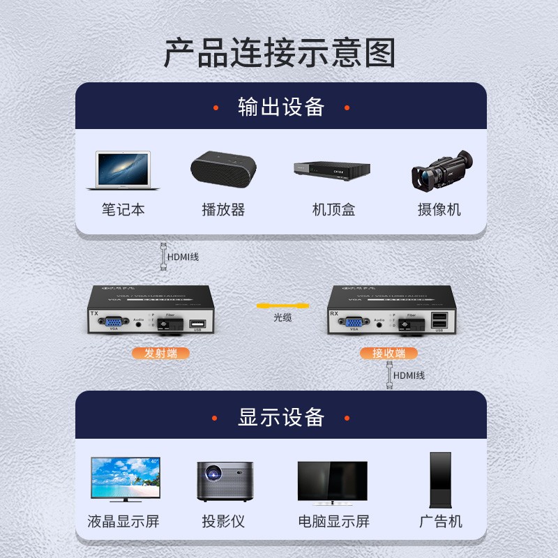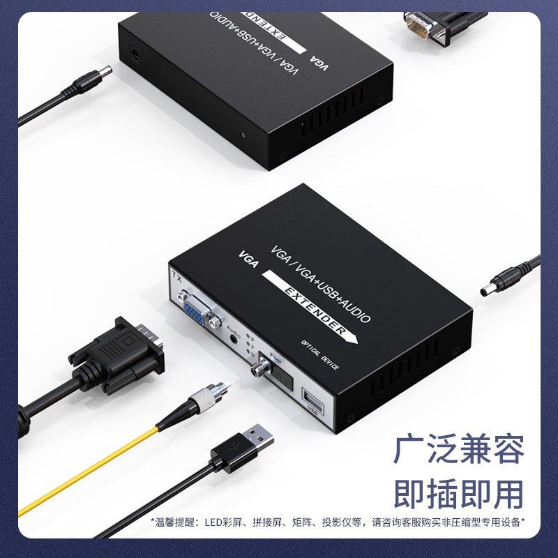 HD VGA with audio (one pair SC) HD VGA + USB keyboard and mouse + audio lossless VGA with audio (one pair SC) lossless VGA + USB + audio (one pair SC) USB keyboard and mouse + local loop out + audio non-compression + loop out + audio (one pair) non-compression + USB + loop out + audio (one pair) 100 meters network cable extender
