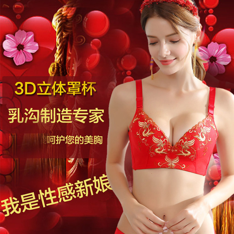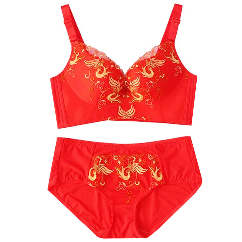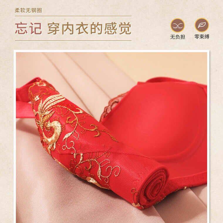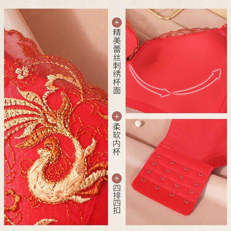 Big red small chest push up wedding bride bra set zodiac year phoenix embroidery no steel ring sexy underwear women