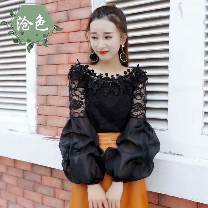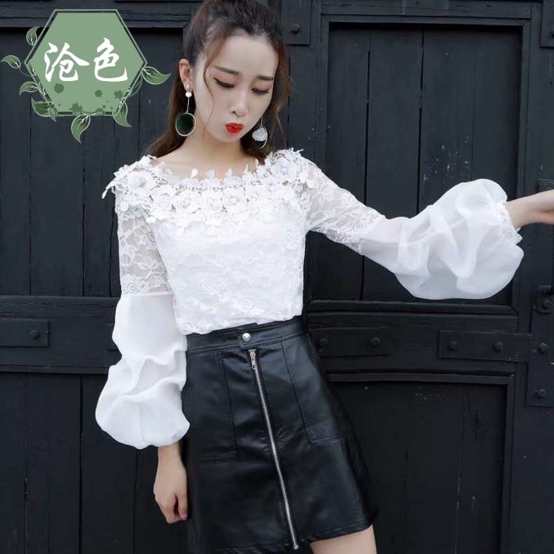 Every day special autumn women's slim-fit leaky shoulder one-word collar bubble sleeves white lace shirt Chiffon long-sleeved top handsome
