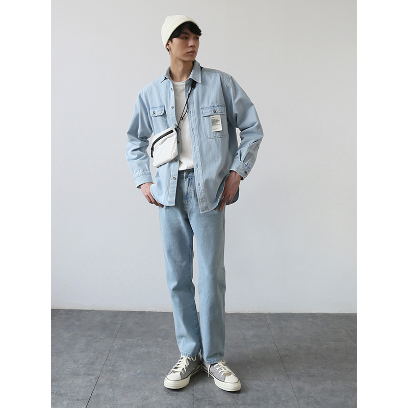 Model students very good color light blue washed slightly loose straight-leg jeans light luxury men's trousers - Taobao