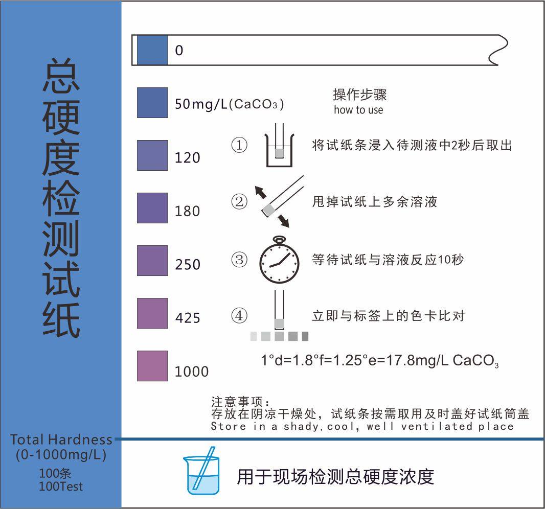 High concentration total hardness test paper 0-1000mg L is used for calcium and magnesium hardness testing of boiler water and seawater wastewater
