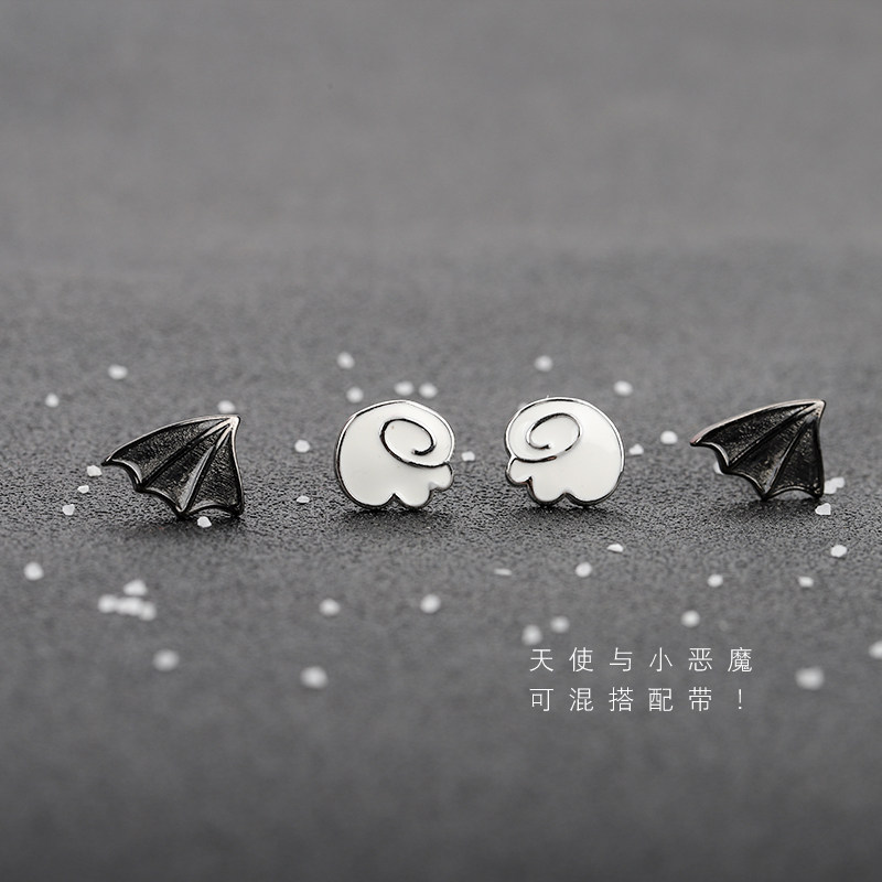 A pair of black devil earrings, a pair of white angel earrings, a pair of black devil earrings, a single white angel earrings