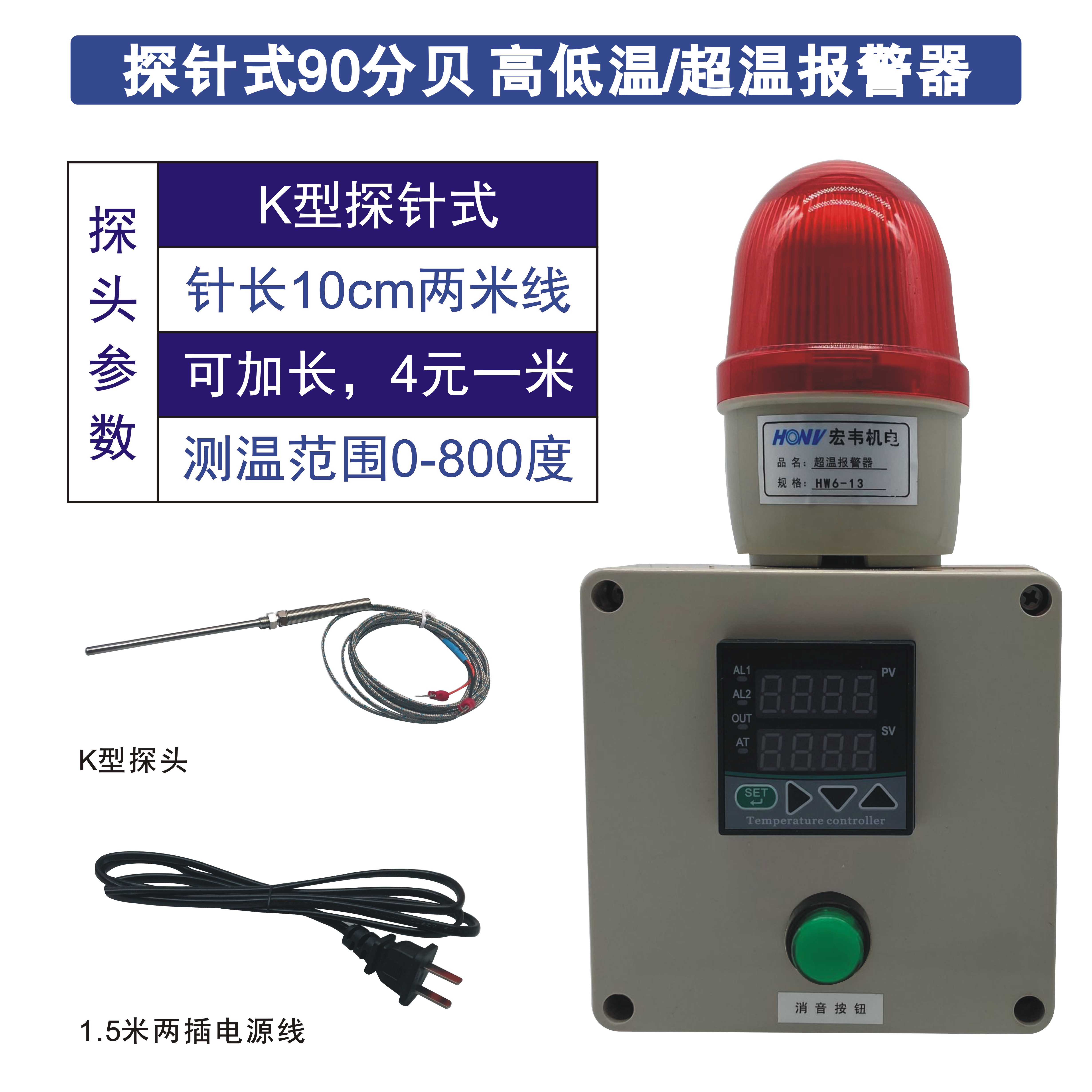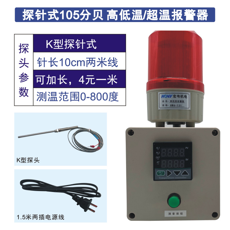 Over-temperature alarm with mounting hole High and low temperature alarm with installation hole sound 90 dB over-temperature alarm with silencer sound 90 dB high and low temperature alarm with silencer sound 105 dB over-temperature alarm with silencer sound