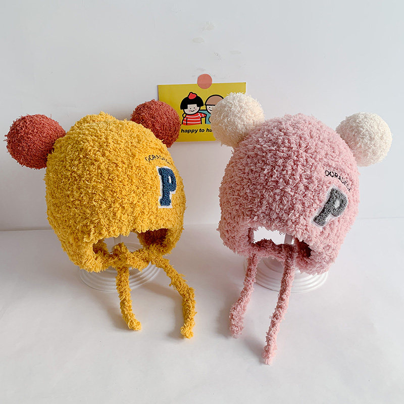 Baby hat autumn winter male and female baby thickened protective ear cap ultra cute ball ball baby warm hat child plush hat