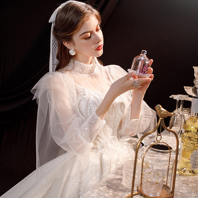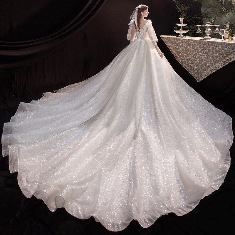Long-sleeved large size pregnant women light main wedding dress 2021 new bride heavy industry luxury tail cover thick arm French starry sky
