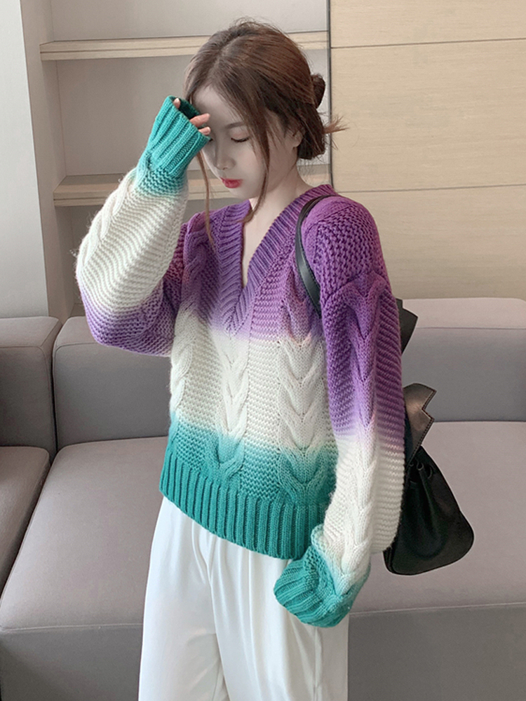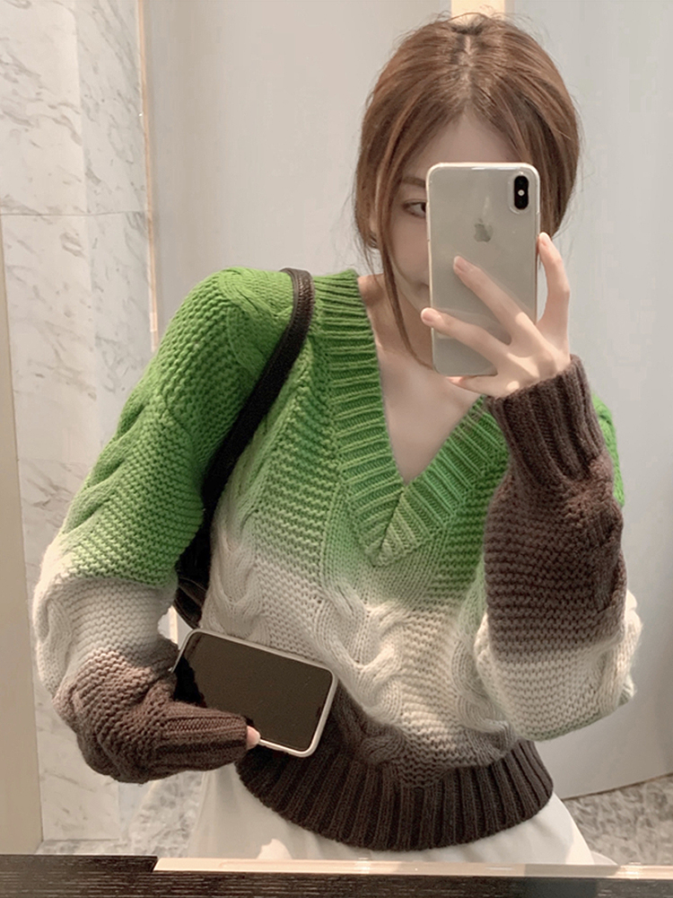 V-neck twist sweater women's autumn and winter outerwear Mori ins tide personality gradient color top design sense niche knitwear