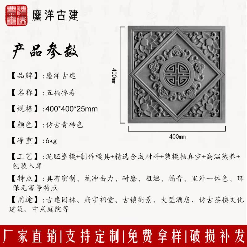 Antique Chinese-style brick carving floor brick courtyard wall brick indoor square decoration floor blue brick 40cm five blessings and longevity