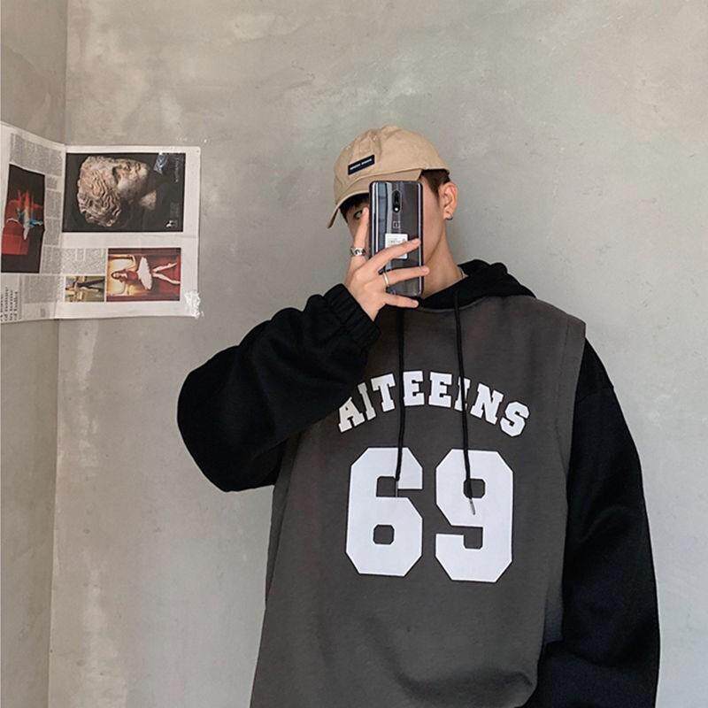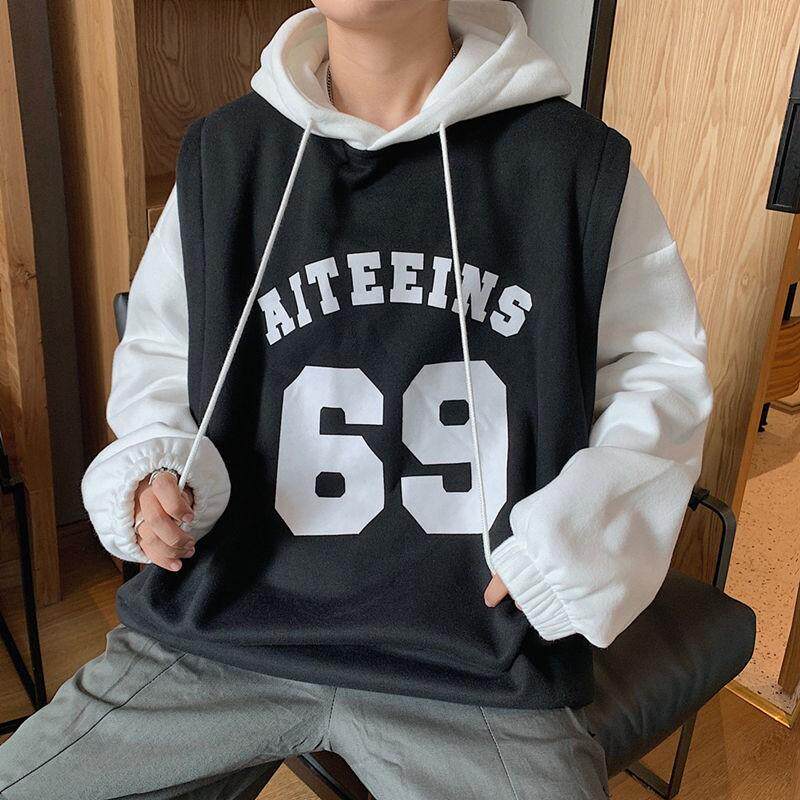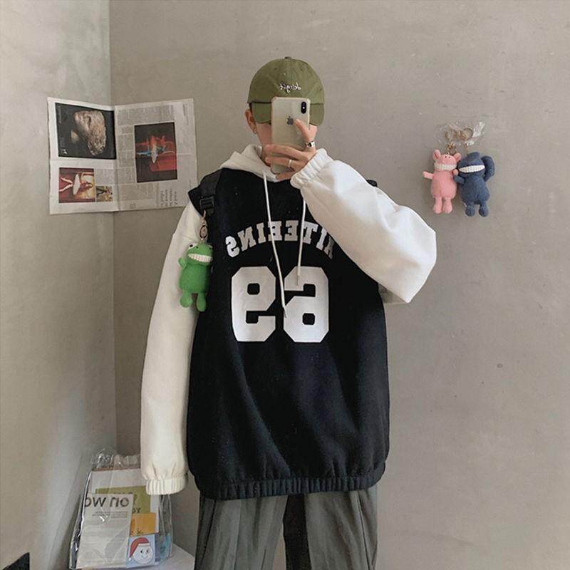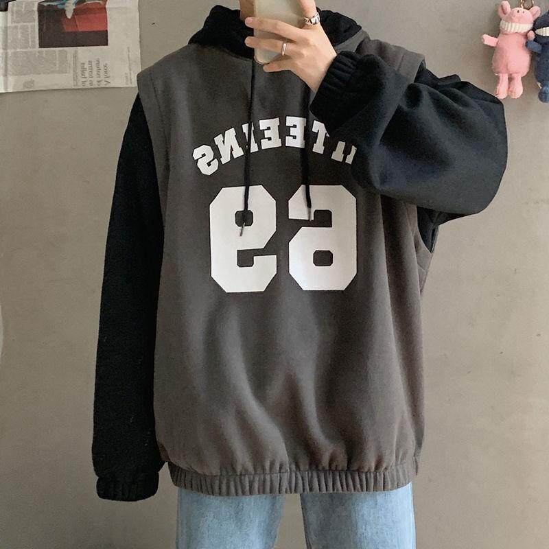 Basketball suit ins wind fake two pieces plus fleece sweatshirt autumn hooded Korean version loose trend student autumn coat male