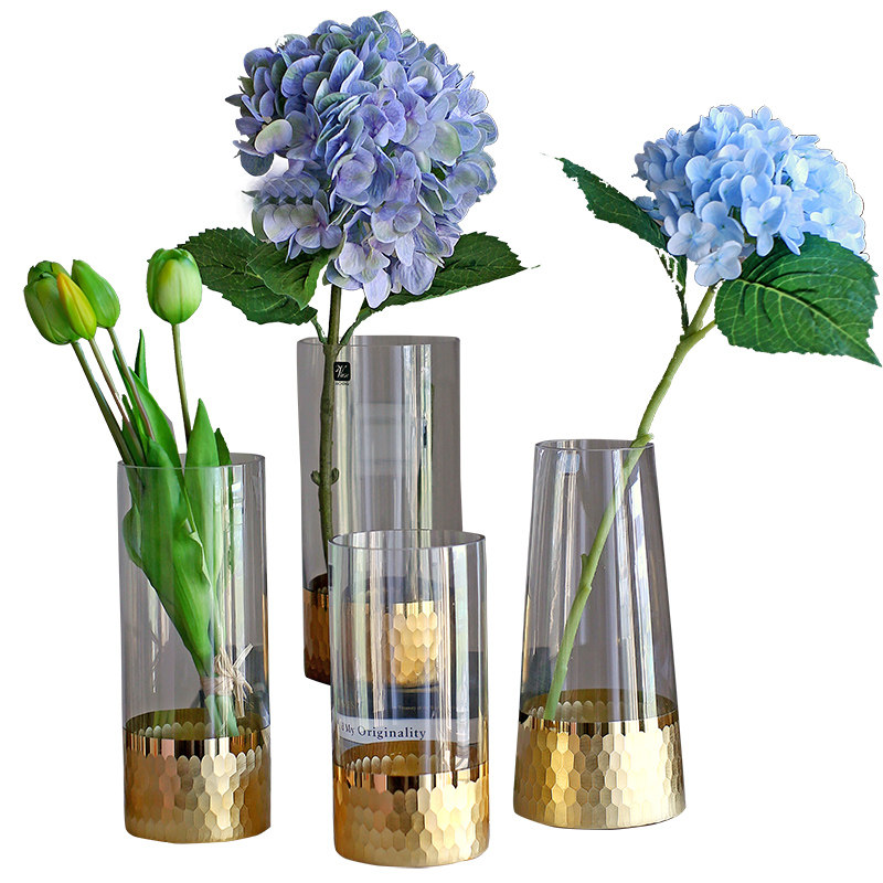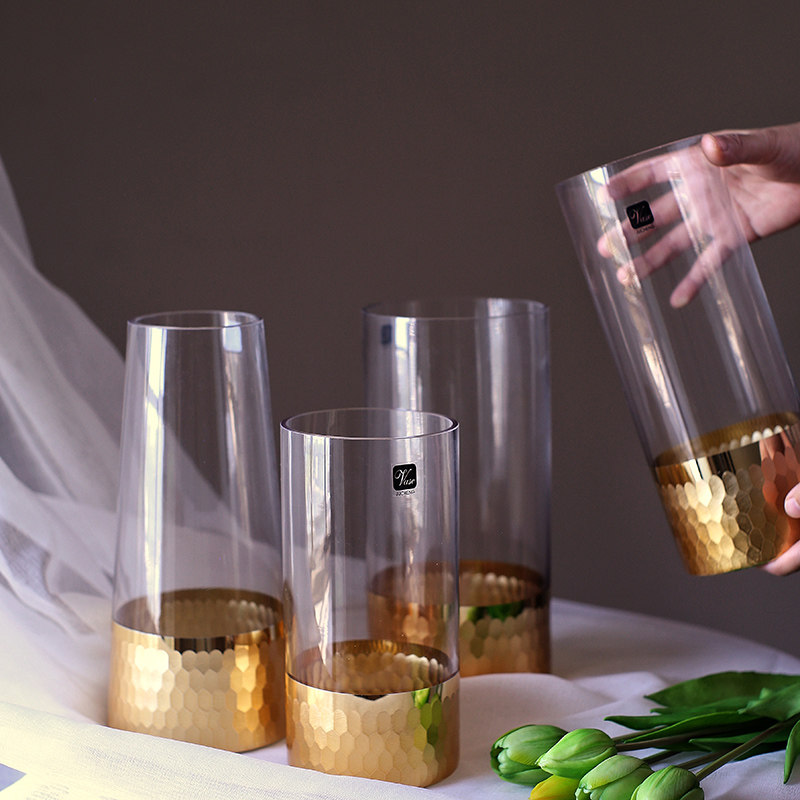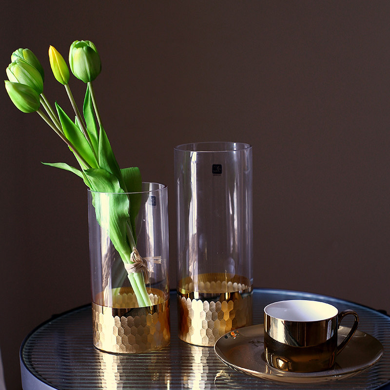 Gold hand-grinded gold foil honeycomb straight tube hydroponic glass vase Nordic style home soft decoration ornaments