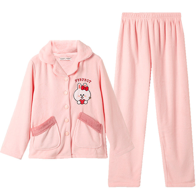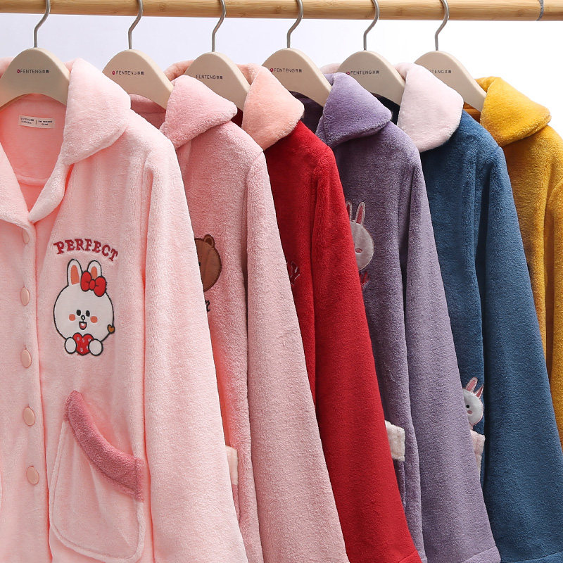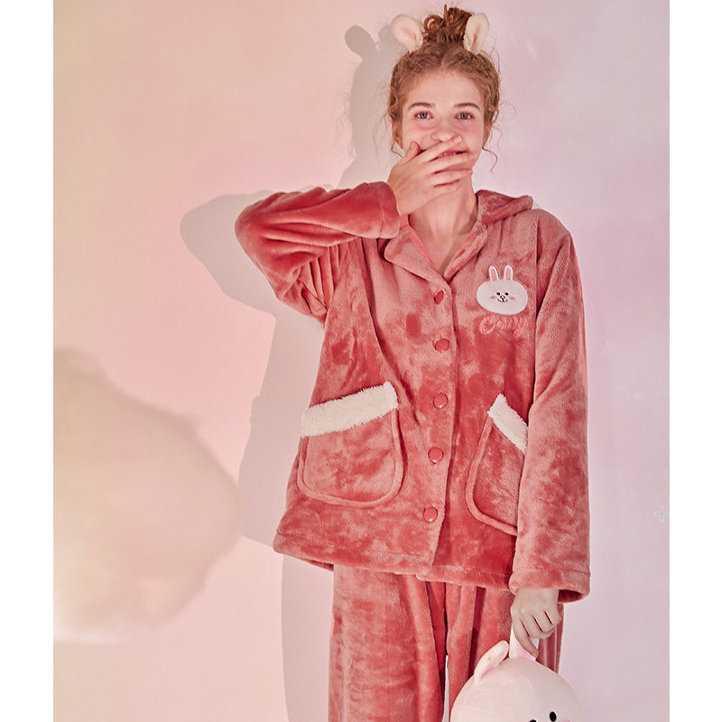 Finten Autumn Winter Coral Suede Palate Woman Sweetness Cartoon Brown Bear Plus Suede Thickened Flannel Woman Home Suit Suit