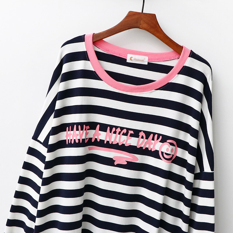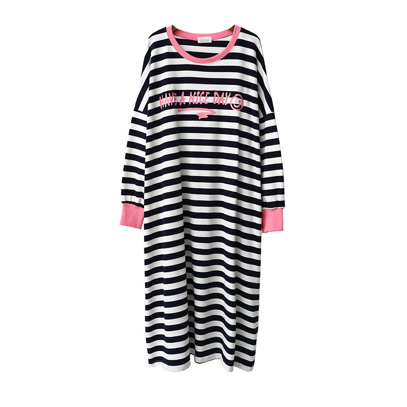 Pure Cotton Large Size Size Sleeping Skirt Woman Autumn Casual All-cotton Striped Long Sleeve Long Skirt Large Version Fat MM Spring Autumn Sleeping Clothing Home Dress