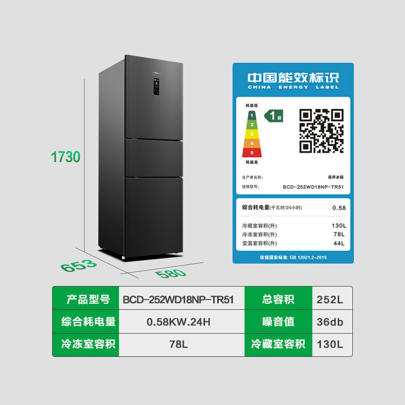 Ronshen Rongsheng 252-liter three-door dual-frequency air-cooled frost-free first-class energy-saving household small refrigerator