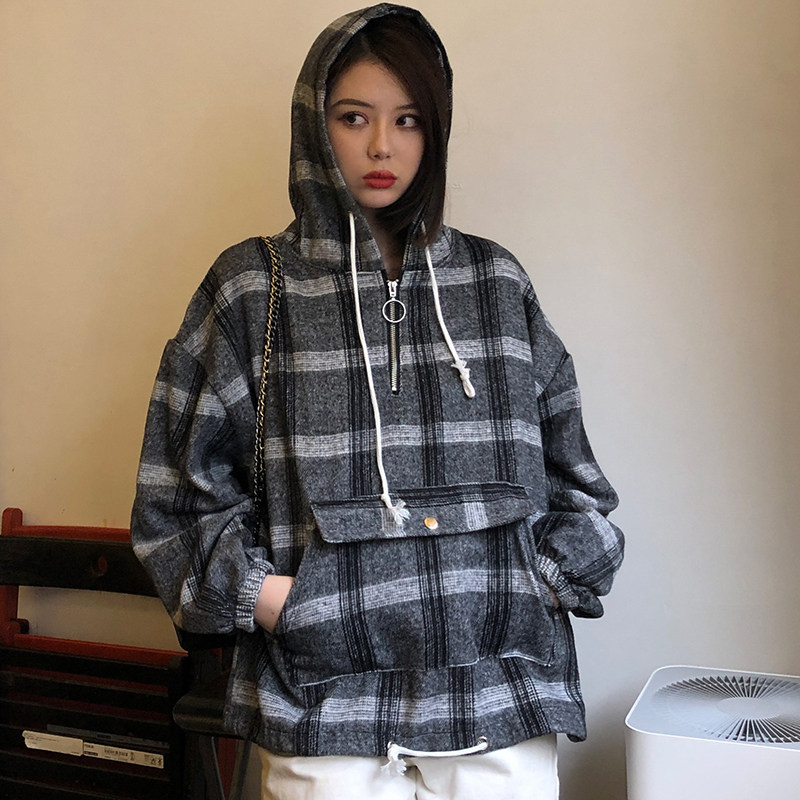 Real shot hooded woolen woolen loose half zipper student college style long-sleeved thickened plaid zipper jacket female